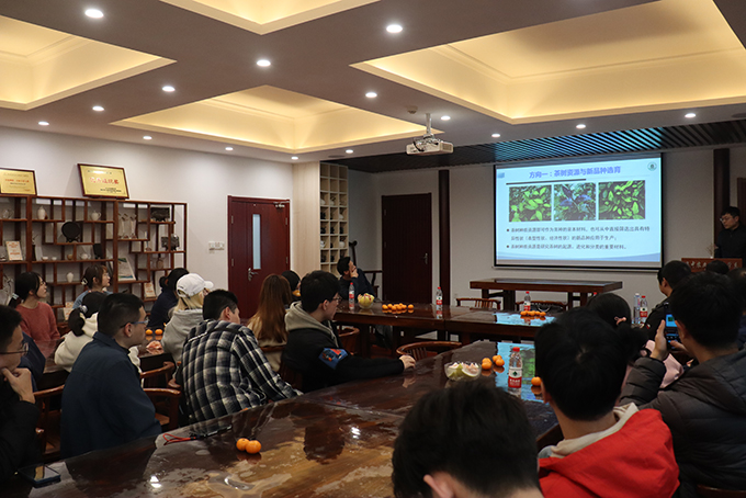 副教授郭飞与同学们交流了目前茶树的小RNA功能的鉴定分析,接着副教授赵华给同学们展示了有机茶园的管理,同时她还向大家讲述了目前富“硒”茶研究的现状。她表示,当前的富硒茶还有很大的改进空间,这就给茶学人带来了新的挑战。她说:“硒茶是我们湖北的特色品牌,把硒茶做好是我们的责任与使命。”讲师王郁向同学们介绍了茶树的多倍体育种让同学们了解到茶树多倍体育种的积极意义。“目前,茶学领域还存在着尚未攻克的难题。”讲师王明乐向大家讲述了目前茶树组培领域的难关,茶树组织中内生菌等问题尚未得到很好的解决,让诱导出的茶苗“夭折”在培养皿中。老师们的分享让同学们大开眼界,从崭新的角度认识到了茶学专业。