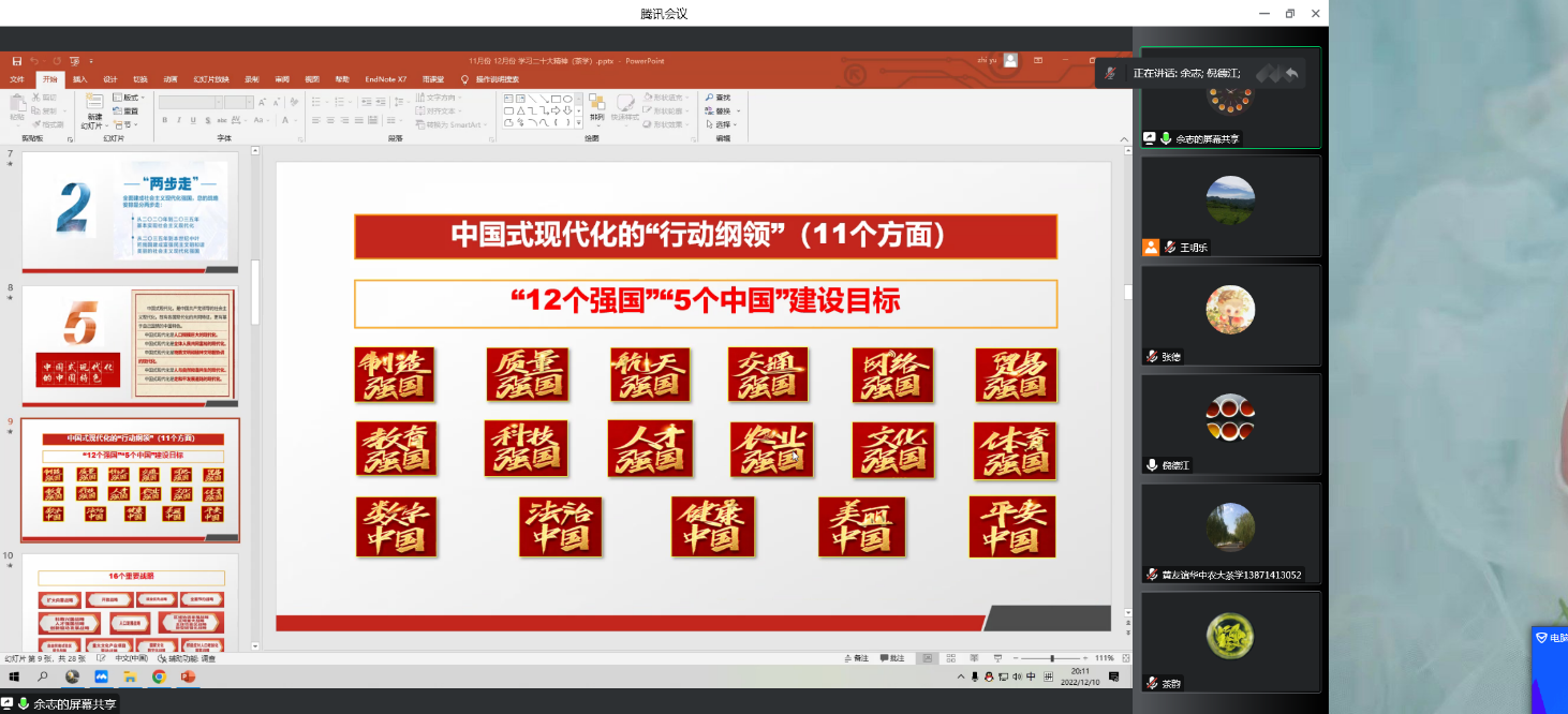 12月10日晚,茶学系教工党支部开展主题党日活动,学习党的二十大精神,党支部书记余志同志领学。