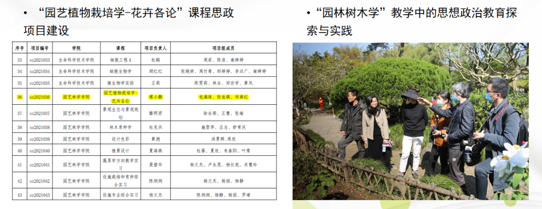 紧跟时代潮流,做好课程思政建设。在理论和实践教学方面,园林系通过启发式、探究式等教学方式,利用线上、线下以及混合式等教学模式,提高学生学习积极性,严把教学质量关,将专业知识与思政内容有机结合,获批校级课程思政项目立项,努力培养立场坚定、综合素质优良的专业人才。