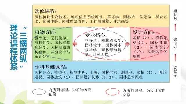 基于学科交叉优势,园林系构建了“三横两纵”的理论课程体系。“三横”即按照“宽基础、强专业、重拓展”的思路,系统构建学科基础课程、专业主干课程和特色拓展课程模块。所有模块,均包含植物类课程和设计类课程,既注重学科的体系性,又注重学科间的交叉,让学生成为“既懂植物,又懂设计”的园林通才;“两纵”即根据学生个人兴趣和发展需求,将专业细分为植物和设计两个方向供学生选择,引导学生由园林通才成长为园林专才,强化行业所需的核心知识和职业发展能力培养。