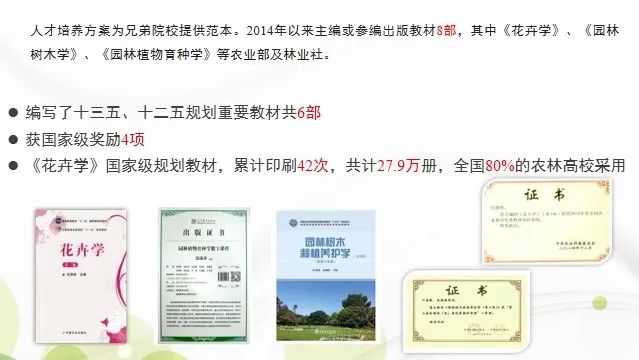 近年来,园林系编写了“十三五”、“十二五”规划重要教材共6部,获国家级奖励4项。其中,《花卉学》为国家级规划教材,累计印刷43次,共计27.9万册,被全国80%以上的农林高校采用。