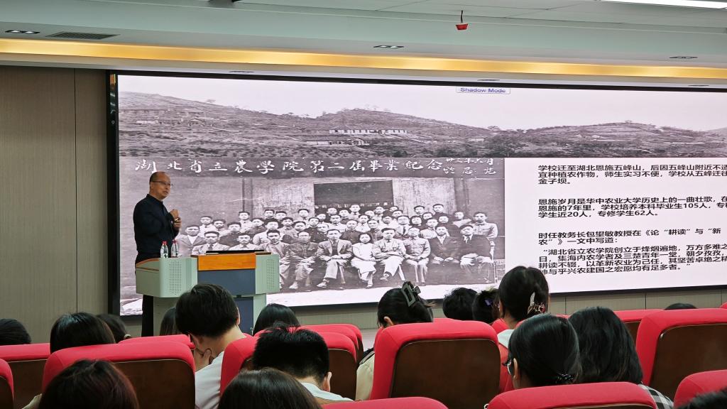 10月24日晚上,李召虎走进襄阳书院报告厅,带领我院和化学学院的202名研究生新生,在读懂华农的历史、现在和未来中领悟、传承耕读精神。李召虎以“弘农学、扬国光,日新永无疆”为题,围绕办学规模、师资结构、学科专业、人才培养、人才队伍、学科建设、研究平台、科技创新、社会服务和国际合作与交流等方面介绍了学校发展历程与办学成就。李召虎指出,学校从农务学堂起源,坚守并不断弘扬125年办学历史沉淀而成的耕读文化精神,是我校精神文化的核心。他希望研究生新同学们在求学过程中立志“宏农学、扬国光”,以实际行动践行“与祖国同行、为人民奉献”的价值追求。