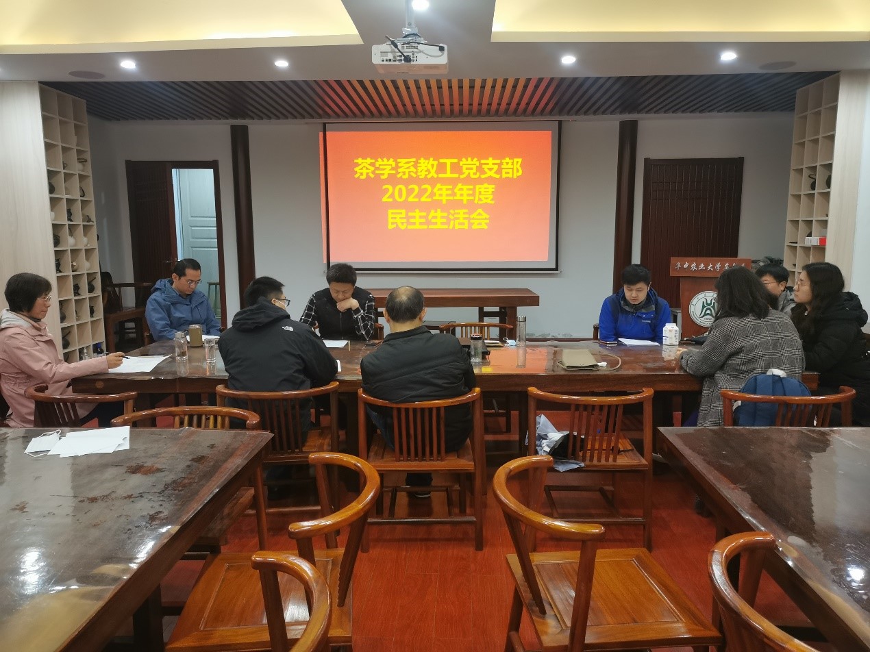 2月12日晚,园艺林学学院茶学系教工党支部在园林北楼406室开展了“2022年度组织生活会”。会议由茶学系教工党支部书记余志主持,学院党委委员李峰参加会议。