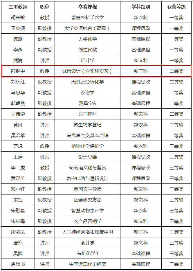 根据中国高等教育学会《关于举办第四届全国高校教师教学创新大赛的通知》、湖北省高等教育学会《关于举办第四届湖北省高校教师教学创新大赛的通知》等文件精神,按照华中农业大学第四届教师教学创新大赛赛事安排,经学院遴选推荐、材料评审、现场评审等环节,大赛最终评选出一等奖5人,二等奖7人,三等奖12人。我院风景园林系教师邵继中团队获二等奖,团队成员杨璐、夏欣、丁静蕾。