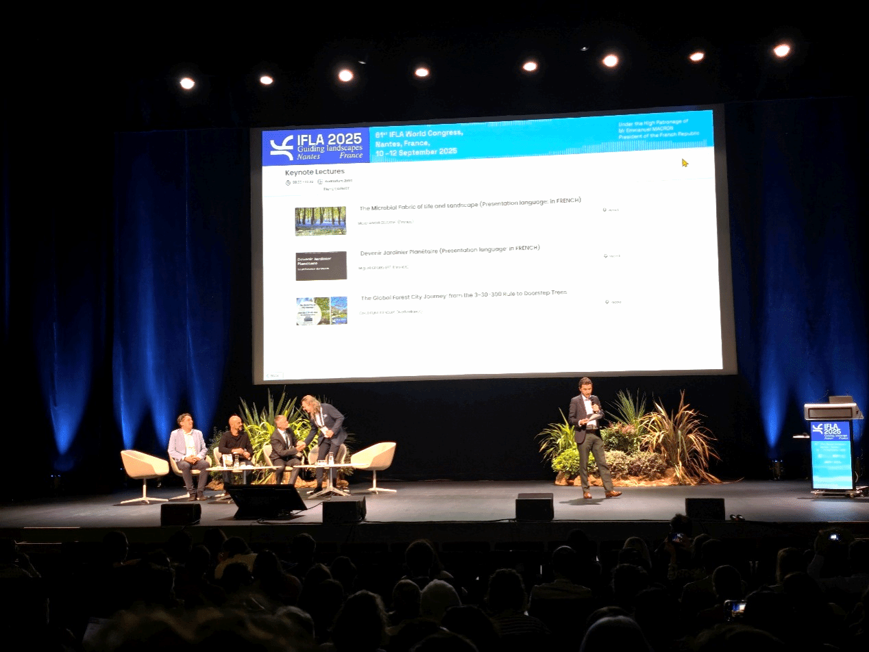 2025年9月10-12日,第61届国际风景园林师联合会(International Federation of Landscape Architects, 简称IFLA)世界大会在法国南特召开。本届大会的主题为“引导性景观(Guiding Landscapes)”,聚焦新型韧性城市社区的规划、设计、管理与更新,城市雨洪管理、生物多样性发展与生态系统服务改善等核心议题。大会邀请全球风景园林行业从业者、政策制定者及专家学者等多方人员共同参与,就“引导性景观“的行业实践及相关研究前沿开展积极交流与探讨。