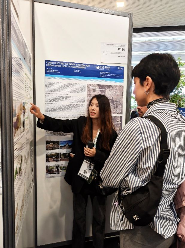 在海报展示区,来自世界各国的学者和设计师们主要展示了与主题“引导性景观(Guiding Landscapes)”相关的规划设计与研究成果。博士研究生李小琦(导师:张斌教授)及胡雨琳(导师:杜雁副教授)参加了现场学术研讨并做海报展示。李小琦博士进行了题为“Integrating Biocultural Diversity into Large-Scale Landscape Planning: A Governance Approach for Karst Regions” 的海报展示。其研究聚焦具有高度生态-文化脆弱性的喀斯特地区,探讨如何将生物文化多样性纳入大尺度区域规划和治理框架,以增强卡斯特地区景观管理的适应性与包容性。胡雨琳博士进行了题为“Reconceptualizing the Role of Landscape Architects: A Process Analysis of Xinxiang Garden, Jiangxinyuan Neighborhood, Wuhan, China”的海报展示。其通过武汉市江欣苑社区宅间绿地的设施与景观提升这一实践项目,展示了设计师在项目中“引入-打破-重建”专业人士身份继而构建“合作者”社会角色的新型参与模式。