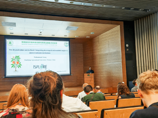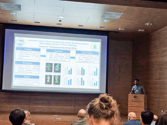 会议涵盖植物低氧适应的多个前沿方向,包括性状与生理生态、发育调控、信号感知与转导、分子与代谢响应等专题。博士后Muhammad Ateeq作了题为“How do peach plants survive floods? Integrating physiological and metabolic insights to uncover molecular mechanisms”的大会报告,系统阐述了课题组在桃树涝害生理与分子机制方面的最新研究进展,引发与会专家的广泛关注与讨论。博士生Muhammad Atiq Ashraf以墙报形式展示了其在氧化钙纳米颗粒增强桃苗耐涝性方面的研究成果,并在一分钟口头展示环节中精彩呈现研究亮点,获得了现场学者的积极反馈。