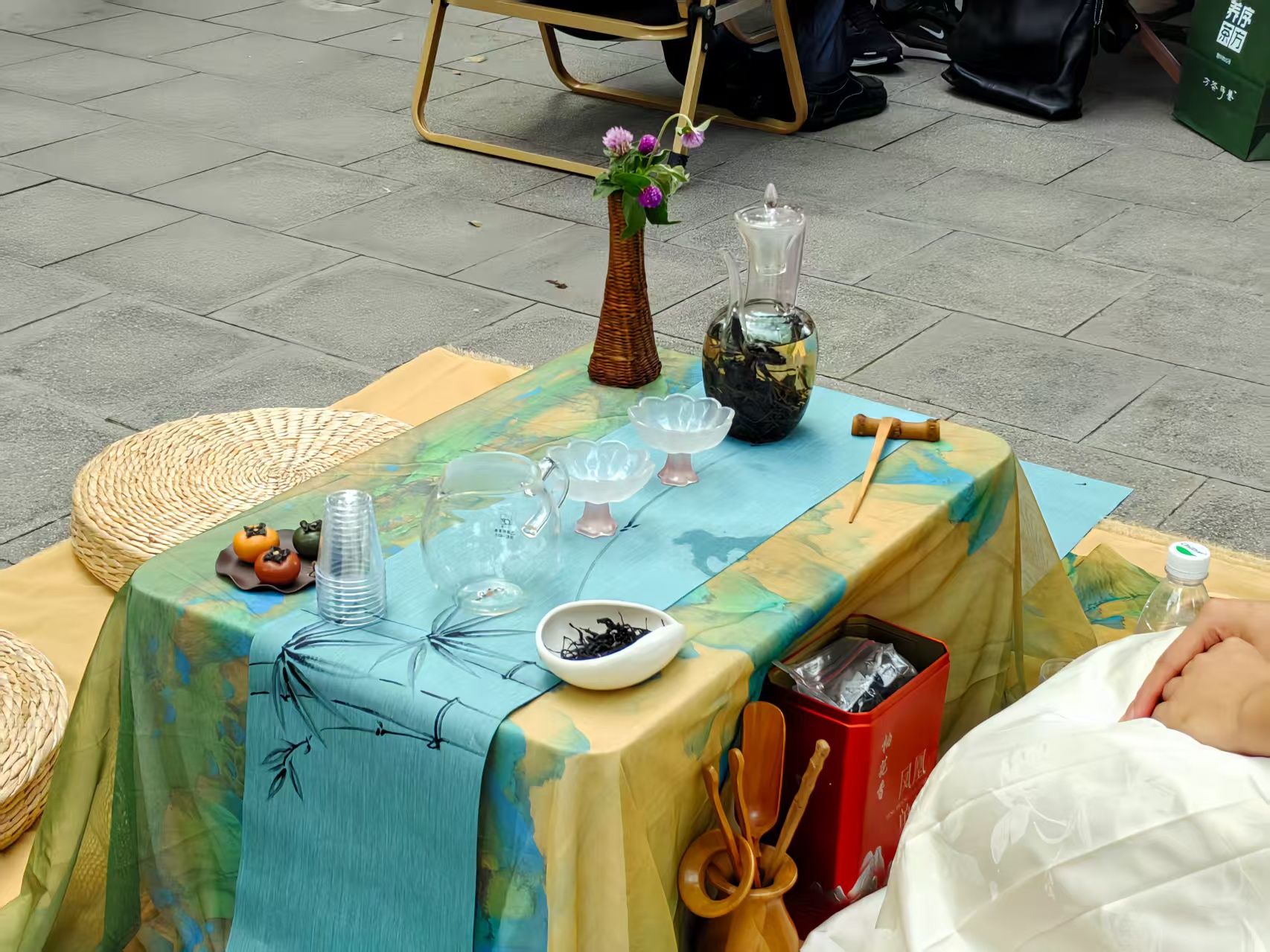 9月28日下午一点,同学们早早来到活动现场,投入到茶席布置工作中。茶学2301班孙佳雨、施宇涵作为负责人,在王郁老师、志愿者的帮助下对茶席进行了精心布置:以“千里江山图”桌布为底,搭配蓝绿色竹纹茶旗,勾勒出清雅的中式意境;玻璃茶具晶莹剔透,花瓣样品茗杯粉嫩雅致,为茶席增添了几分灵动;“柿柿如意”茶宠小巧可爱,与藤编花器插着的几支淡紫色小花交相呼应,更显中秋时节的浪漫意趣。精致的茶席很快吸引了众多茶友驻足欣赏、拍照打卡。