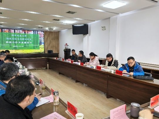 龙健飞一行首先在湖北省林科院书记石道良等陪同下,了解了湖北省林科院建院历史、发展概况、近期成果等。在随后开展的座谈会上,省林科院主要领导、科研相关各处室负责人、林学相关领域科研所负责人、主要科研骨干等10余人参加交流座谈,座谈会由省林科院副院长何丽华主持。龙健飞首先介绍了我校基本概况、学院和林学学科发展情况,随后就双方开展科教研一体化合作的提出了建议。他指出,华中农业大学和湖北省林科院长期以来开展了各种形式的合作交流,并取得了一系列较好的成果,在新形势下双方深入开展系统性的合作交流的空间、必要性、重要性进一步凸显,建议重点围绕以党建为引领的交流机制,优势互补争取大项目,联合申报重要科技成果,联合开展基地创新平台建设,谋划多水平高层次人才联合培养,深入合作开展高质量科技服务等,共同为湖北省绿色高质量发展和中部崛起提供科技支撑。