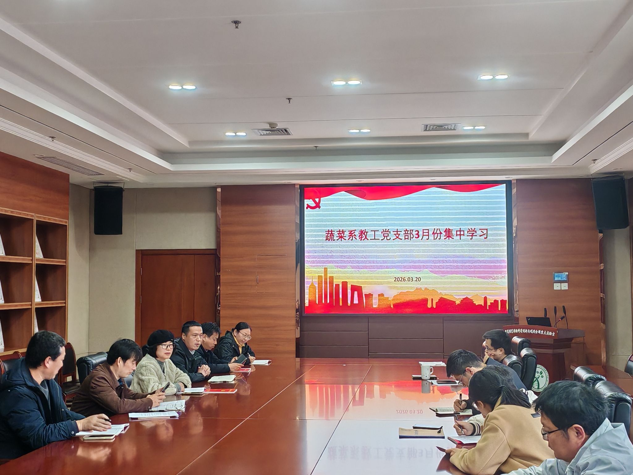 3月20日上午,蔬菜系教工党支部在园艺林学学院南楼206会议室开展3月份主题党日活动。本次活动包括蔬菜系全体教师学习全国“两会”精神、学习习近平总书记关于树立和践行正确政绩观的重要论述、谋划支部2026年度工作和党员民主测评四个方面内容,旨在通过深学细悟,将国家大政方针与蔬菜学科发展实际紧密结合,为新一年的工作指明方向。主题活动由聂碧华同志主持,张余洋同志领学。学院副院长周继荣同志到会指导。