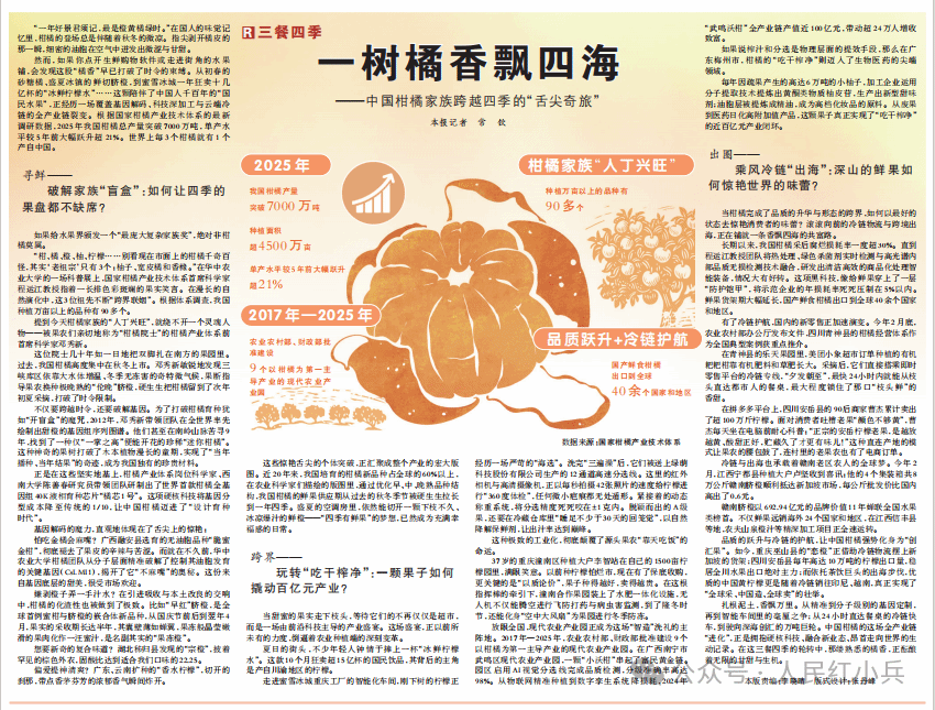 正是在这些坚实地基上,柑橘产业体系岗位科学家、西南大学陈善春研究员带领团队研制出了世界首款柑橘全基因组40K液相育种芯片“橘芯1号”。这项硬核科技将基因分型成本降至传统的1/10,让中国柑橘迈进了“设计育种时代”。(人民日报记者 常钦)