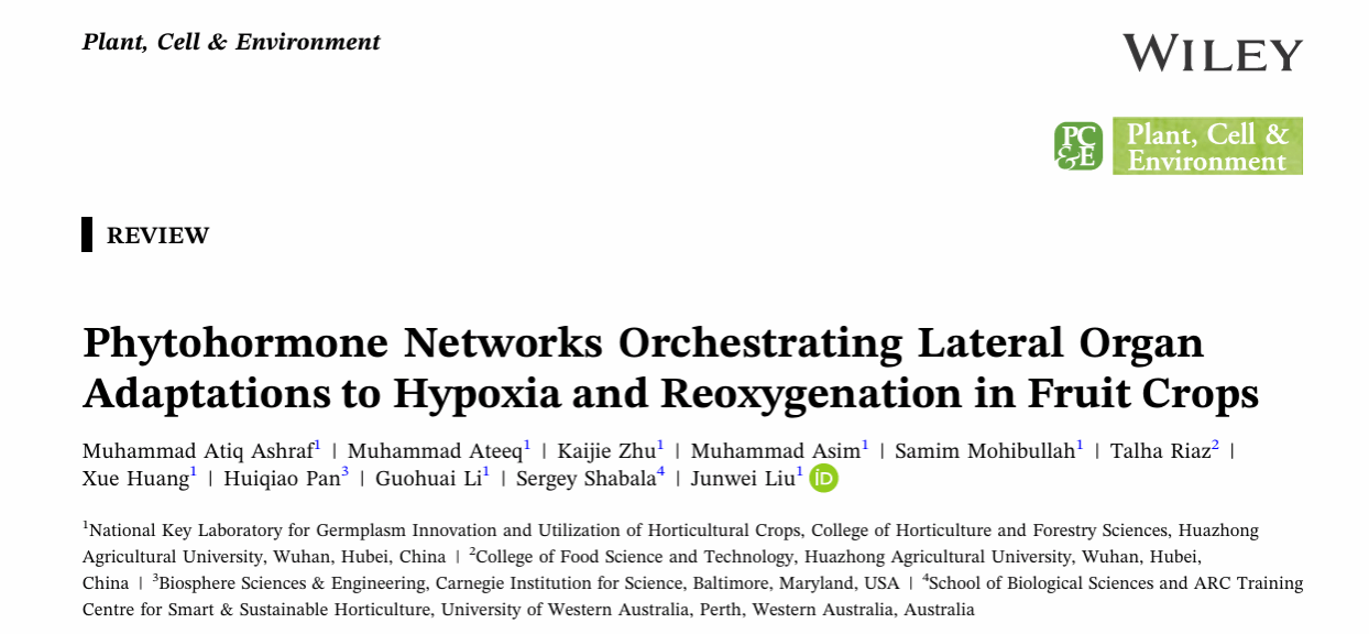 随着全球极端气候事件频发,水涝胁迫已成为制约果树产业可持续发展的关键非生物逆境之一。与一年生作物不同,果树作为多年生木本植物,器官受损后恢复缓慢,且水淹过程中伴随的“低氧-复氧”循环会引发更为复杂的次生损伤。近日,华中农业大学园艺林学学院桃栽培生理与生态课题组在植物学领域知名期刊Plant, Cell & Environment上在线发表了题为“Phytohormone networks orchestrating lateral organ adaptations to hypoxia and reoxygenation in fruit crops”的综述论文。该文系统阐述了果树在低氧及复氧过程中,如何通过激素互作网络精密调控侧生器官(如不定根、通气组织、茎干伸长)的可塑性适应,为果树抗涝育种与栽培管理提供了新的理论框架和策略方向。