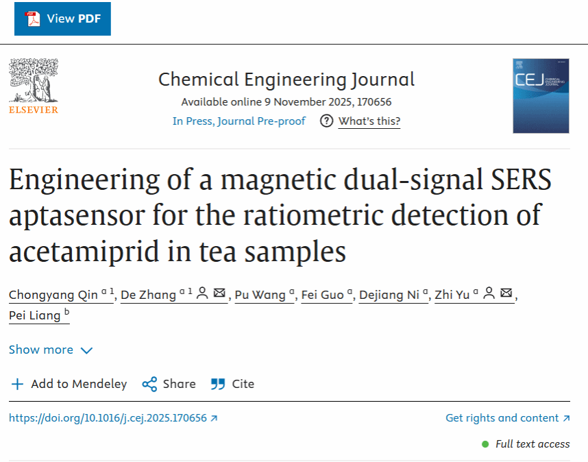 近日,华中农业大学园艺林学学院、果蔬园艺作物种质创新与利用全国重点实验室倪德江教授团队张德副研究员和余志副教授在国际学术期刊Chemical Engineering Journal上在线发表了题为“Engineering of a magnetic dual-signal SERS aptasensor for the ratiometric detection of acetamiprid in tea samples”的研究论文。本研究提出了一种可以在茶叶复杂基质中高效磁性富集、快速、特异性检测啶茶叶中虫脒农药残留的有效策略,为保障茶叶质量安全奠定了研究基础。