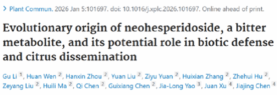 近日,华中农业大学园艺林学学院柑橘品质生物学与调控团队在Plant Communications发表了题为“Evolutionary origin of neohesperidoside, a bitter metabolite, and its potential role in biotic defense and citrus dissemination”的研究论文。该研究系统追溯了芸香科柑橘亚科植物中特征风味与生物活性物质类黄酮新橘皮糖苷类物质(Neohesperidoside,Neo)的生物合成通路关键基因分化导致其前苦味表型(区别于柠檬苦素诱发的延迟苦味)起源、形成和演化的历史脉络,发现其在适于药用与食用柑橘的种质中呈现截然不同的驯化模式。同时,研究还揭示了Neo在柑橘亚科植物抵御生物胁迫及地理分布扩张中的重要作用。