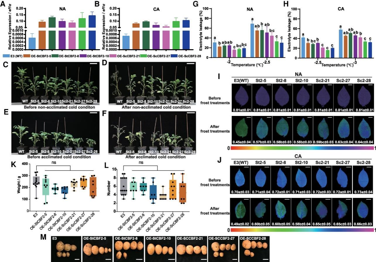 本研究中对46种抗寒能力各异的马铃薯基因型中的同源CBF2基因进行了分析,揭示了关键的结构变异,包括一个与抗寒性密切相关的关键位点(位点A)。在确认位点A与抗寒关联后,作者在不耐寒的栽培种马铃薯E3(S. tuberosum)中分别过表达ScCBF2(来源于S. commersonii)和StCBF2(来源于E3),获得表达量相当的过表达株系。电解质渗漏率(EL)和叶绿素荧光(Fv/Fm)检测结果表明,OE-ScCBF2植株的抗寒能力显著强于OE-StCBF2植株(图1)。尽管过表达ScCBF2和StCBF2抑制马铃薯株高,但各转基因系在块茎产量和外观上均与野生型无显著差异,这表明ScCBF2是一个极具应用潜力的马铃薯耐寒育种优异基因。