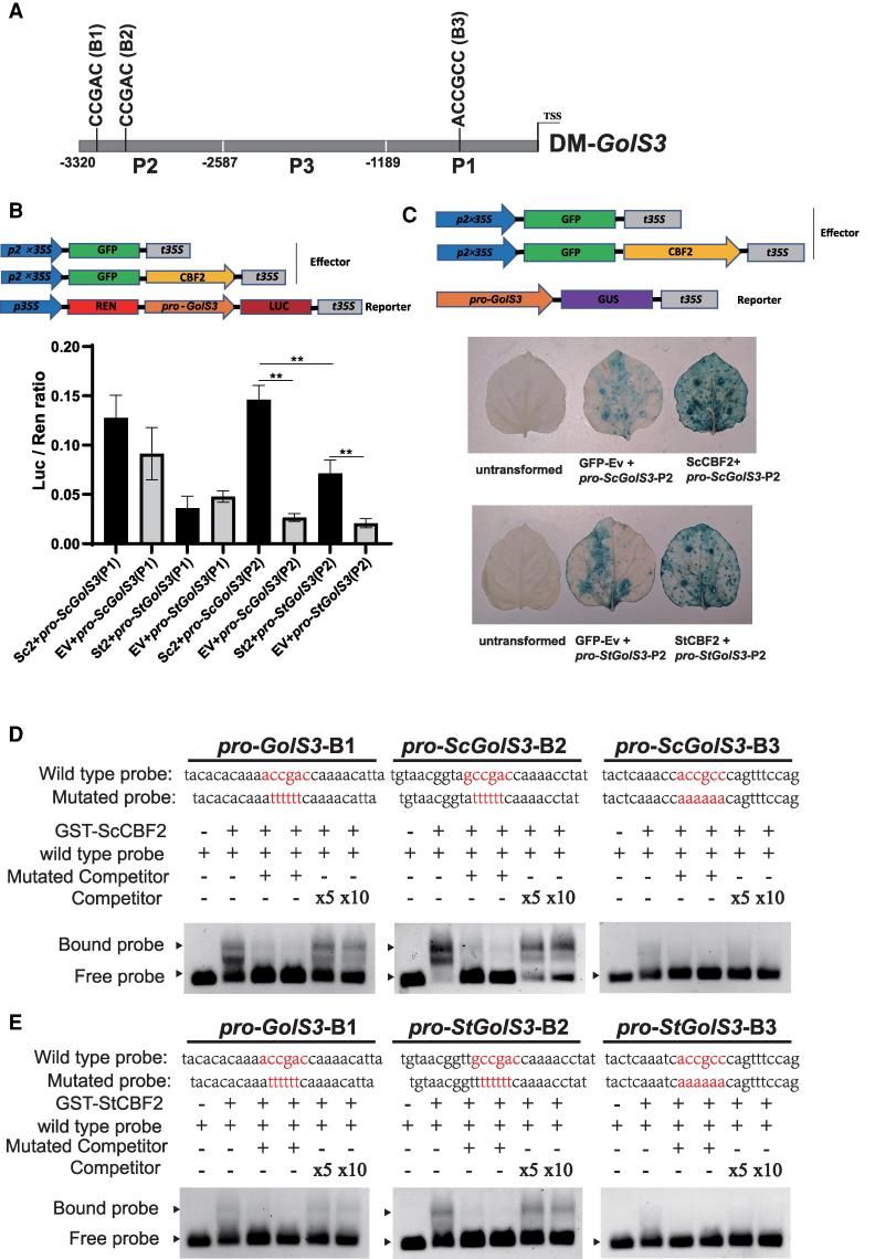 图2 ScCBF2和StCBF2对GolS3启动子的结合和转录激活