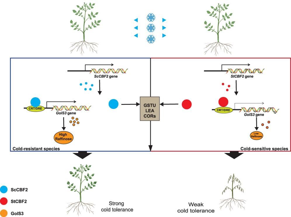 综上所述,本研究系统地揭示了抗寒马铃薯中的ScCBF2等位基因因含有“位点A”,能够高效结合并激活GolS3基因,促进低温保护性物质棉子糖的积累,从而赋予植株强大的耐寒性;而不抗寒马铃薯中的StCBF2等位基因由于缺少该位点,对GolS3的调控能力微弱,无法有效积累棉子糖,导致植株对低温敏感(图3)。该研究不仅深化了对植物CBF调控网络进化和功能分化的理解,也为马铃薯耐寒育种提供了一个极具价值的优异等位基因(ScCBF2)和分子标记(位点A),通过基因编辑或分子辅助选择技术将该优异等位基因导入栽培马铃薯中,有望在不影响产量的前提下,显著提升马铃薯的抗寒能力,对保障粮食安全具有重要意义。