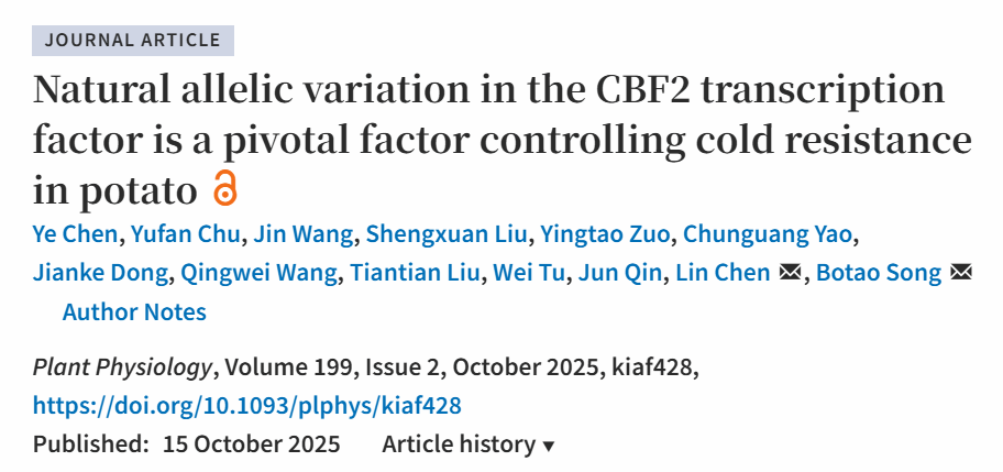 2025年10月15日,华中农业大学园艺林学学院马铃薯团队在Plant Physiology在线发表了题为“Natural allelic variation in the CBF2 transcription factor is a pivotal factor controlling cold resistance in potato”的研究论文,该研究揭示了不同抗性马铃薯种中CBF2的自然变异导致其对于肌醇半乳糖苷合成酶(GolS3)表达的调控差异,进而影响了马铃薯抗寒能力的差异。