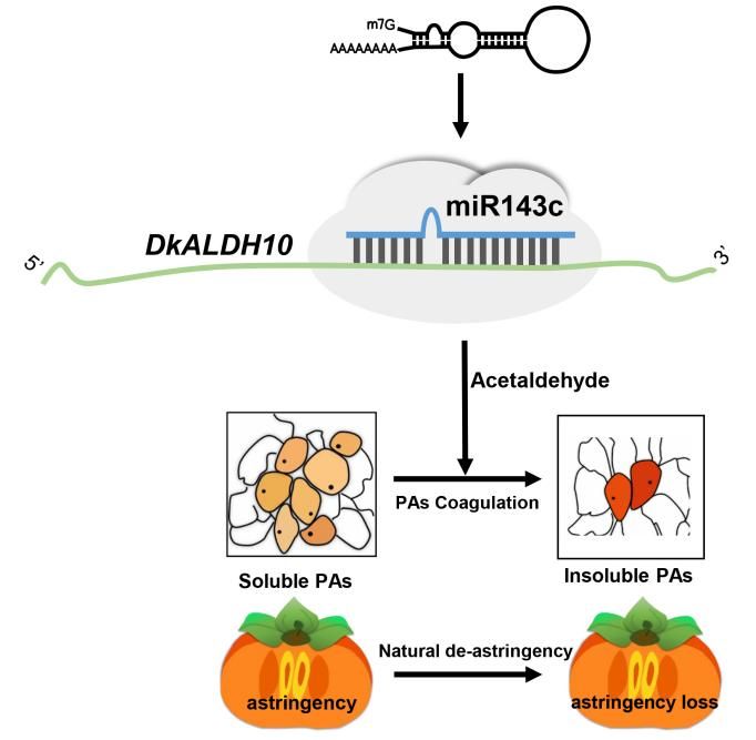 综上所述,该研究揭示了“miR143-DkALDH10-Acetaldehyde-PAs”级联调控中国甜柿自然脱涩的分子模型。这一发现丰富了中国甜柿单宁代谢的分子调控网络,为通过基因手段对涩柿进行甜柿化遗传改良提供了一种新的策略。