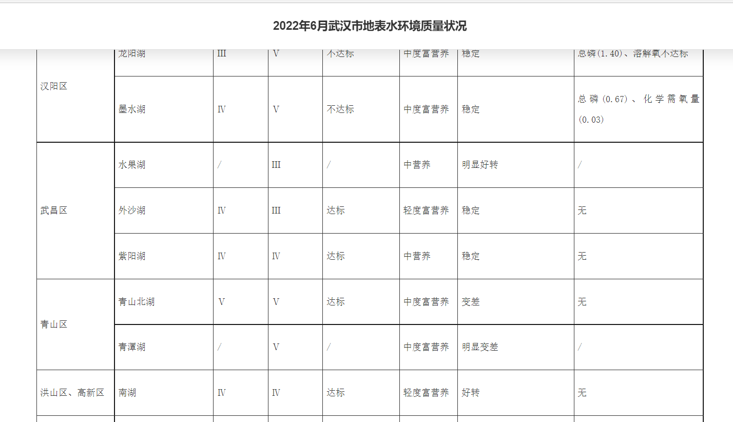 近年来,咬定绿水青山,武汉紧紧围绕“长江大保护”,聚焦南湖、汤逊湖等重点流域水环境治理。通过查阅资料,实践团了解到,经过前期南湖水域雨污分流施工后,南湖边的3个排污口已全部堵住,2019年南湖实现全面截污,2021年水质好转,主要指标达到五类水。据武汉市生态环境局环境监测结果显示,2022年6月南湖水质结果较同期相比好转,水体营养状态由中度富营养化转为轻度富营养化,主要污染物中总磷、氨氮超标情况此次未检出。