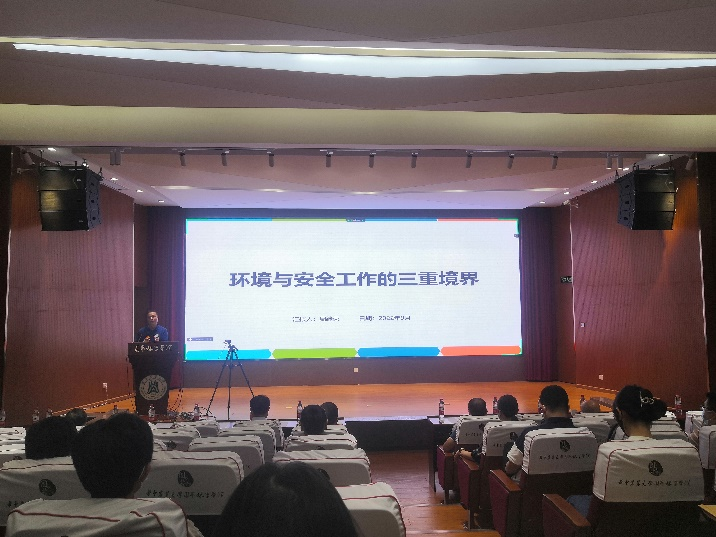 周继荣向师生讲述了环境与安全工作的三重境界,一是法,表示学院会对工作室进行依规治理;二是德,表示要以德化人,师生要习德、养德和弘德;三是道,表示要行道圆融,要将安全管理融入生活方式,融入师生品格。