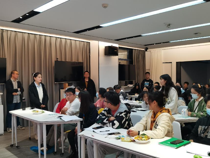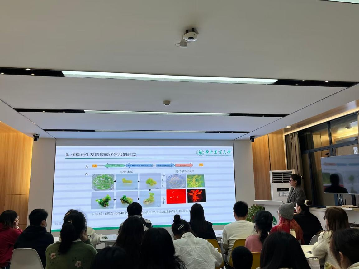 温姣围绕“杨树遗传转化”展开分享交流。温姣简要说明了农杆菌介导法的原理以及农杆菌介导转化杨树的方法。此外,她还向同学们介绍了桉树再生和遗传转化体系建立的过程,并对今后桉树转基因育种和功能基因鉴定做出展望。