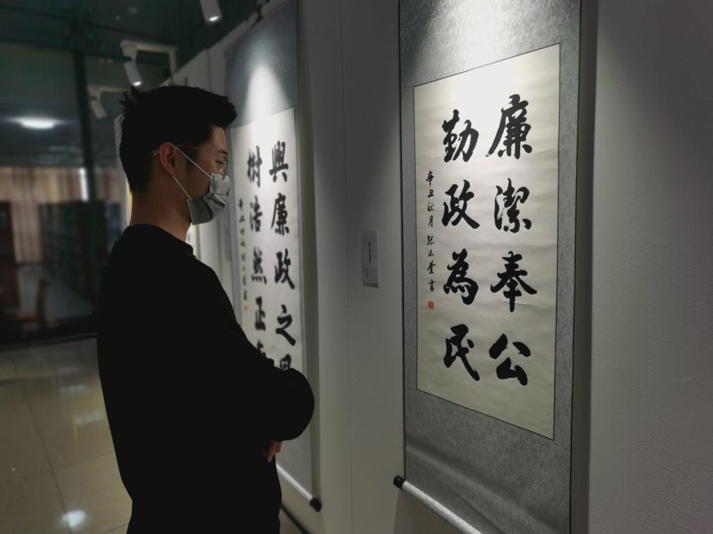 韩福同志在《绘“廉”》作品前沉思良久,他谈到:“这件作品集书法、绘画艺术与党风廉政教育于一体,在传统文化熏陶中接受教育,别出心裁,我们要深入学习和贯彻落实党章党规,在日常学习与生活中要时刻牢记清清白白做事、干干净净做人,把纪律和规矩内化于心、外化于形,用党规党纪规范自身行为,永葆清正廉洁的政治本色。”