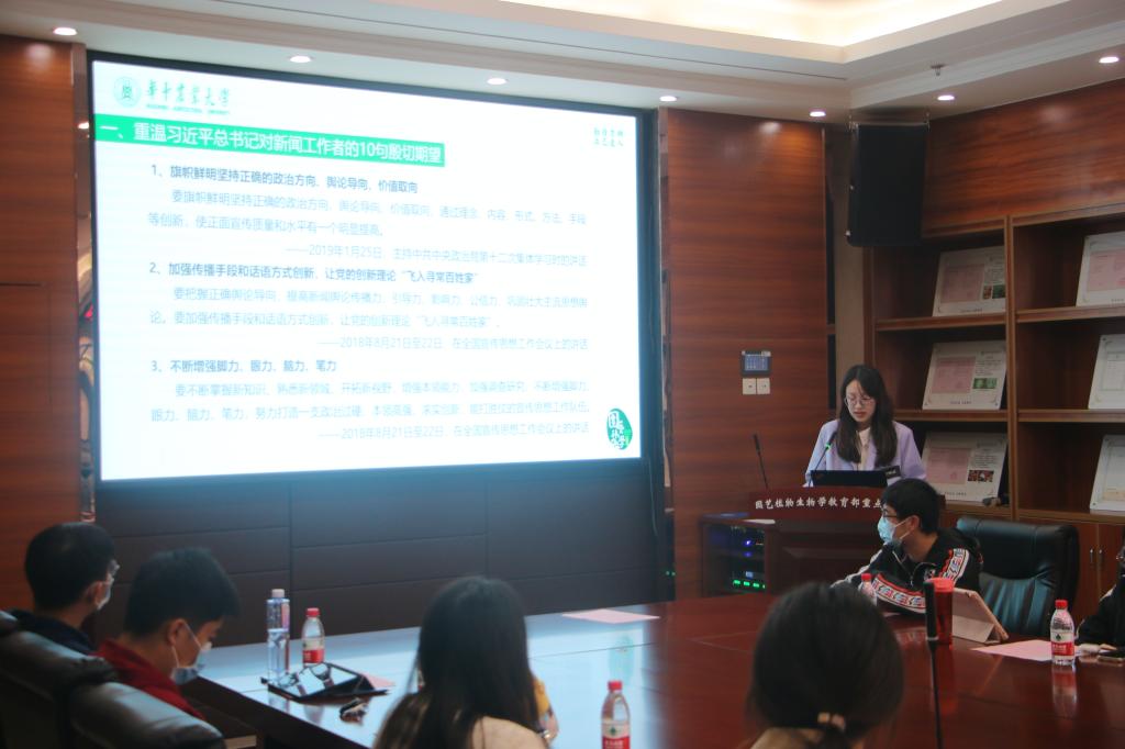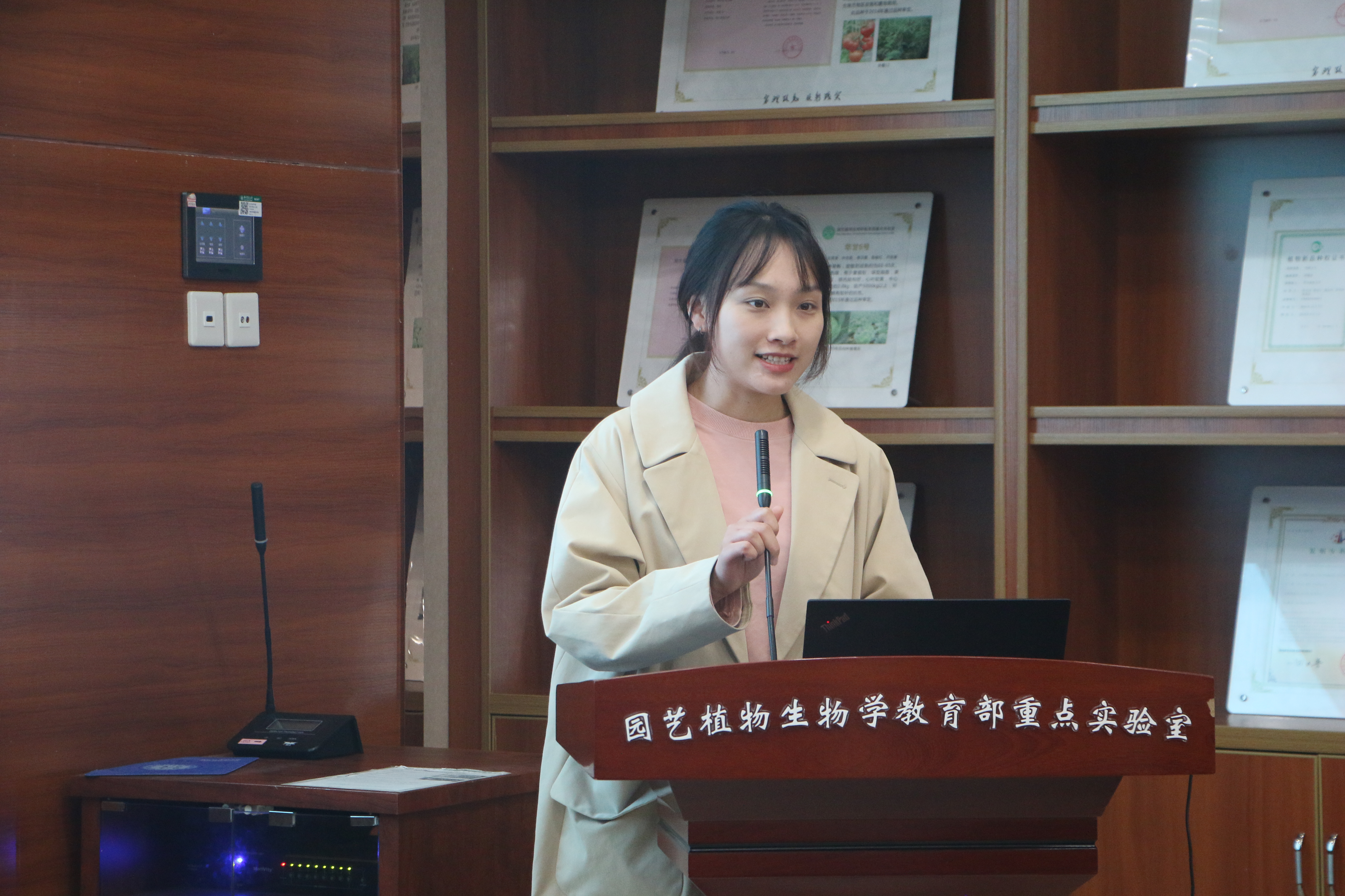 学校学通社记者、学院研究生会主席杨子萱对学院研究生新闻与宣传工作的寄语。杨子萱说到,记者节是中国仅有的六个行业性节日中的一个,作为农业院校的我们更应该以这种特殊的新闻工作者身份为荣。无论是国家大事还是家长里短的报道,只要用心对待这份工作,去感受园林研究生所需求的新闻内容,总会有人欣赏我们的文字与图片,总能有人因为我们的报道而受益而动容。在此之前,需要我们去学习工作的方法、去模仿优秀的作品、去提高记者必备的技能,争取创新和突破,成为一名优秀合格的新闻工作者。同时,她以个人学通社写稿经历分享了作为一名新闻工作者在现场需要做到的几点。不仅要看和听,更要动起来,去收集和整合场上信息,形成一篇完整的新闻呈现出来。最后,她希望在今后的工作中大家都能对新闻工作心存敬畏,在这份工作中得到快速的成长、得到内心的热爱、得到创意思维的新颖不断,一起在这份工作中与学院研究生们同呼吸,与园艺林学学院共进步,讲好园林故事,为卓越园林贡献自己的宣传力量。