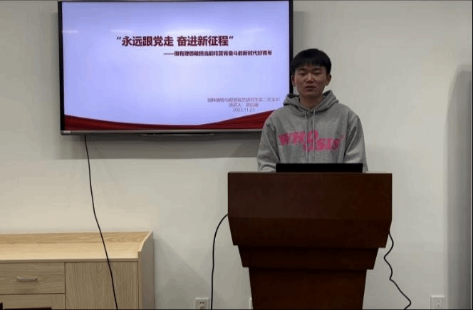 此外,为深入学习宣传贯彻党的二十大精神,激励广大研究生党员用习近平新时代中国特色社会主义思想武装头脑,不忘初心,砥砺奋发,支部开展了主题为“永远跟党走,奋进新征程”的微党课比赛。房晨曦同志以《做有理想敢担当能吃苦肯奋斗的新时代好青年》为题进行演讲,他在演讲中真挚地歌颂了几代中国共产党人经过不懈探索和奋斗获得的伟大成就,并结合习近平总书记对新时代中国青年的深情寄语表达了自己作为一名新时代中国青年的使命和责任,表达了自己争做有理想、敢担当、能吃苦、肯奋斗的新时代好青年和“一颗红心永向党,一生坚定跟党走”的信念。