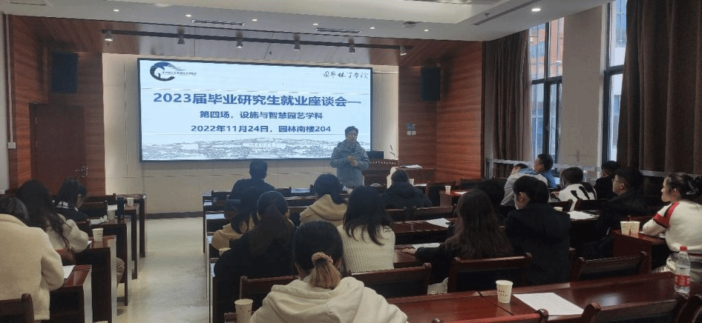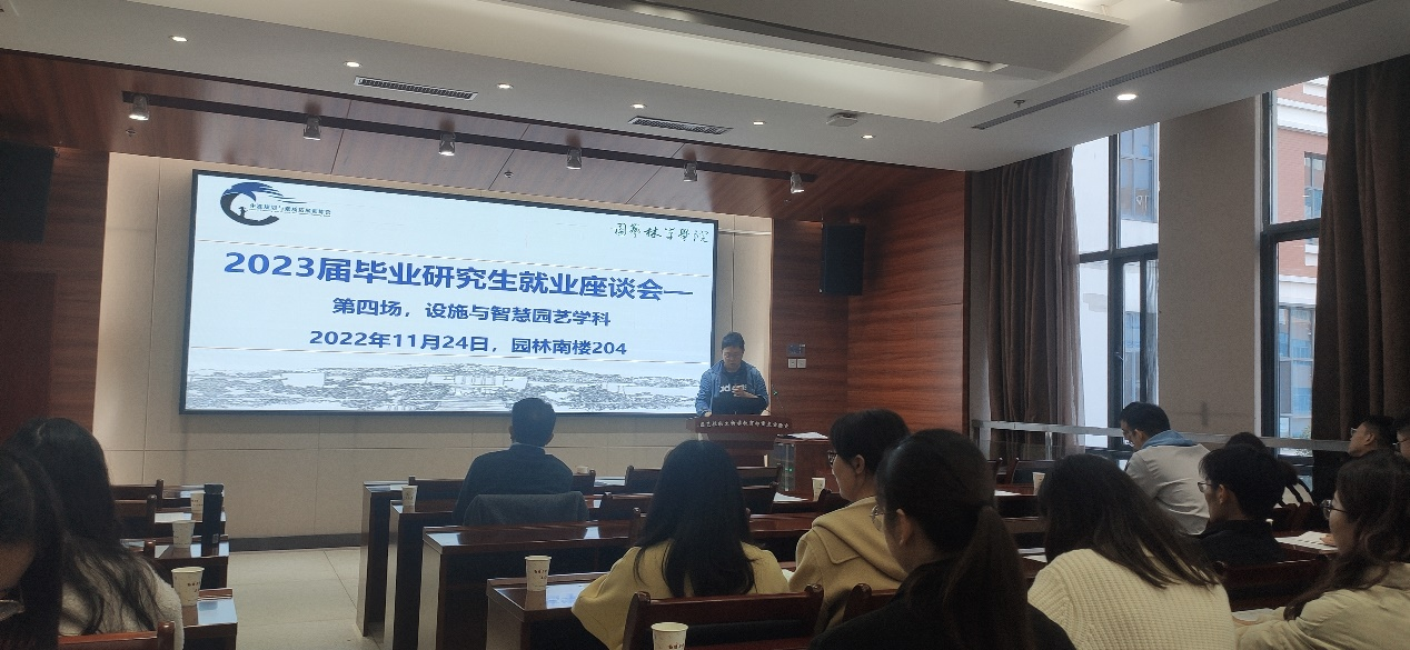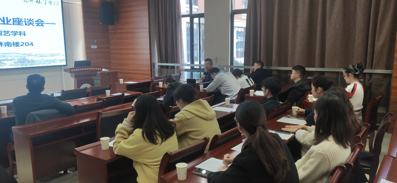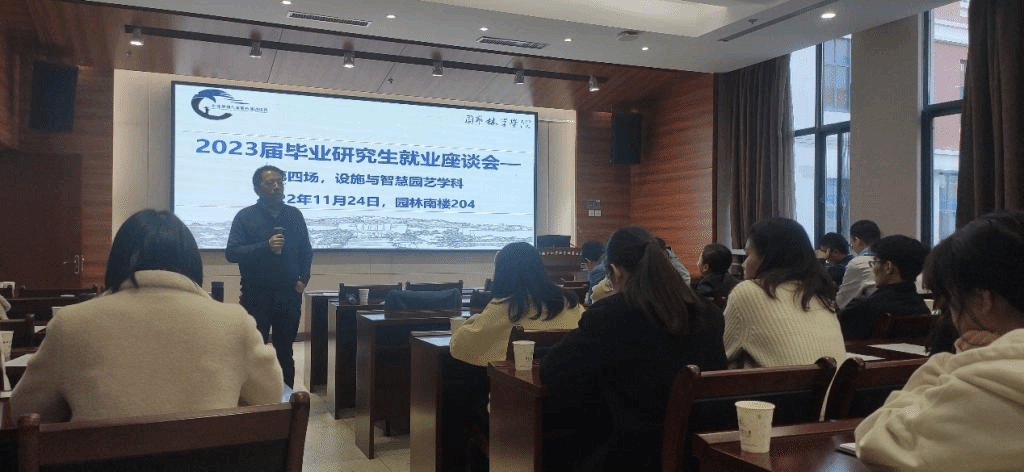 11月24日14时,园林院2023届毕业研究生就业座谈会第四场设施与智慧园艺系专场在园林南楼204会议室举行,学院党委副书记蔡江、辅导员肖晗、设施与智慧园艺系导师别之龙、蔡兴奎、成金桃和2023届设施与智慧园艺系研究生共同参会。