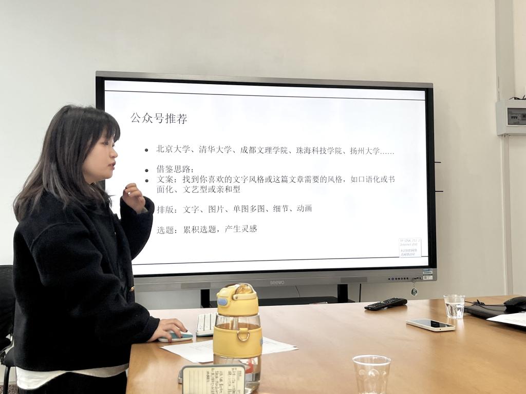部门负责人谢梦缘从公众号运营和对新学期的展望以及后期工作方面安排进行分享。最后用“全局视野破除思维定势,以新思想定向领航,在守正创新中焕发生机。”一句话概括自己的未来的发展与规划。