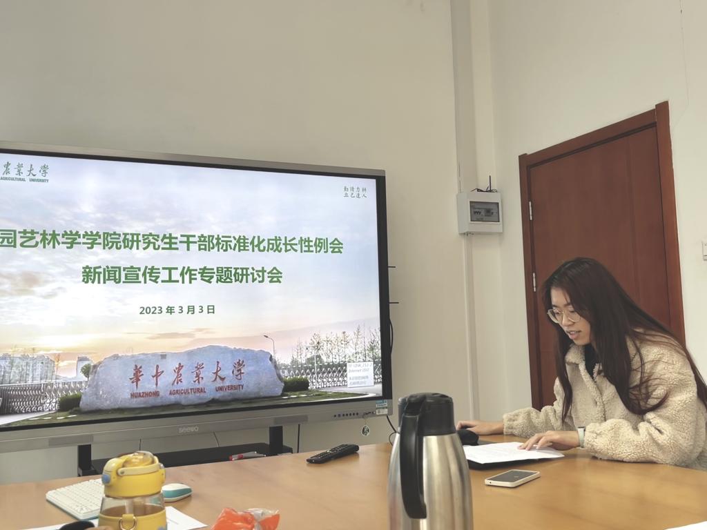 园艺林学学院于2023年3月3日在南楼218会议室召开园艺林学学院研究生干部标准化成⻓性培训会,探讨新闻与宣传工作。参会人员有园艺林学学院研究生辅导员、研究生新闻与宣传中心全体干部、研究生团工委宣传部干部、园艺林学学院研究生会主席团成员。