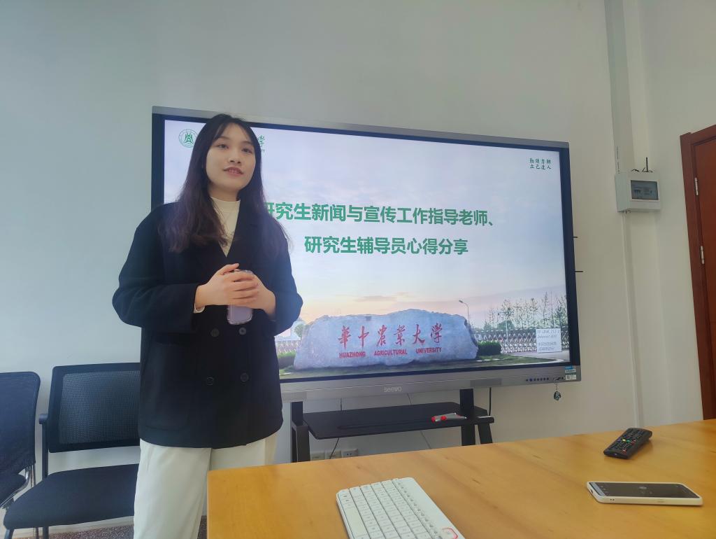 会议的第三项议程,园艺林学学院研究生会主席杨子萱结合自身参与学通社的经验进行分享以及讲述了新闻稿的写稿经验,两次不同的活动参与情况都让她对新闻的报导和新闻稿的书写有了很深的体悟,让我们感受了不一样的新闻写稿经验。