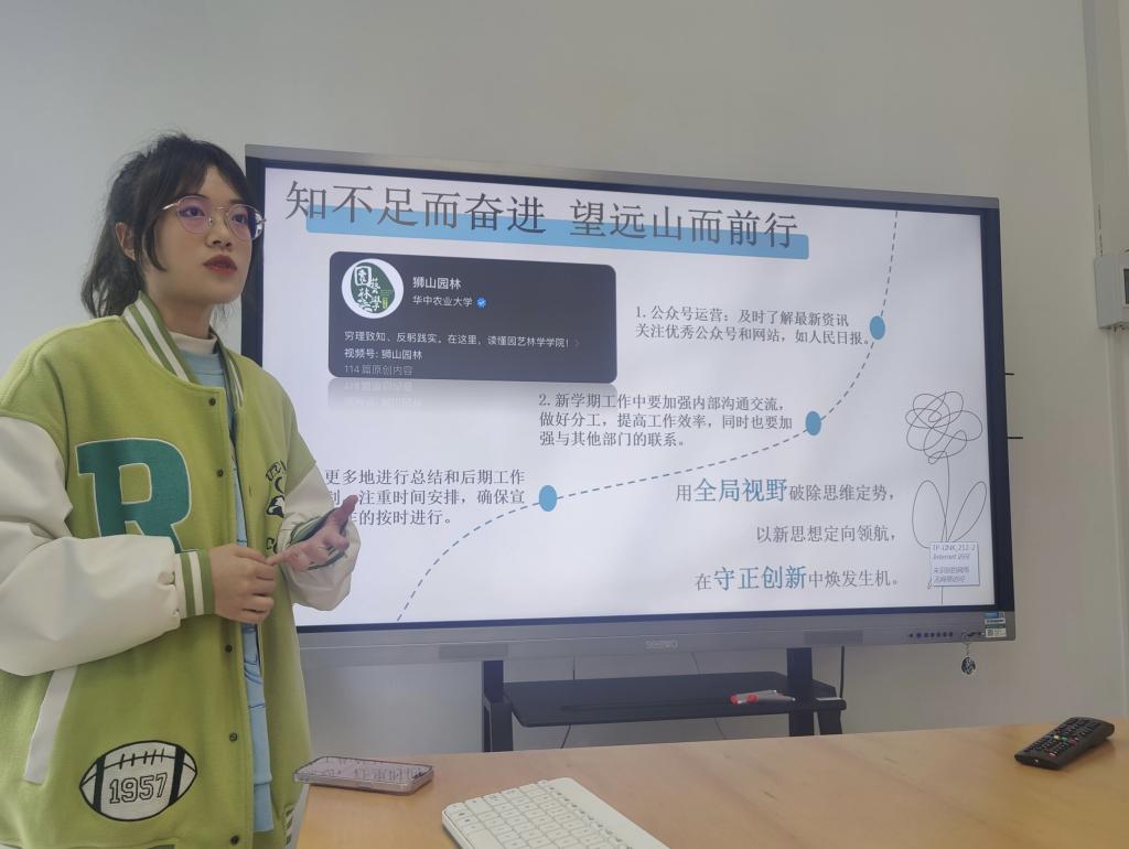 会议第二项议程,由新闻与宣传中心负责人覃语祺对公众号“狮山园林”进行一个关于创新方面的交流与分享,对现存问题进行指出。希望能够加强和其他部门的合作工作,促进大家合作写新闻稿。在新闻稿投递方面指出,投递不同渠道时需要注意新闻发送的时效性。在公众号的推文推送方面,需要注意审稿和推送时间,在排版时多思考、多学习,抓热点,汲取优秀公众号精彩的排版风格和内容,并对未来预期的发展有一个新的规划。