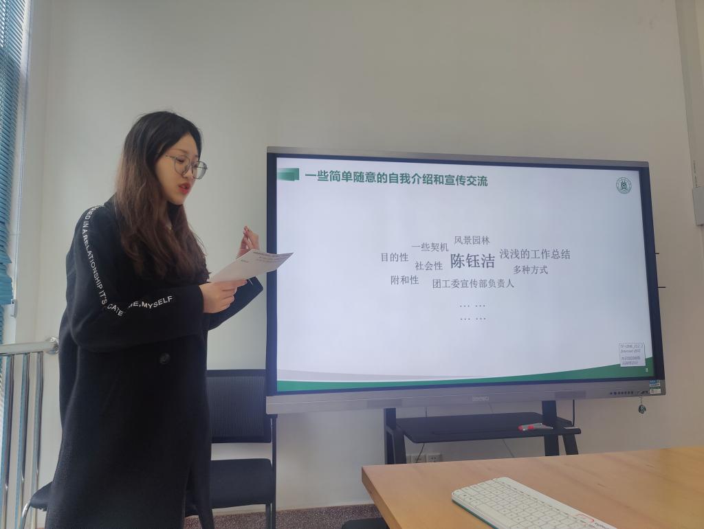 最后,团工委宣传部的负责人陈钰洁分别就一些收获和体验来总结交流上学期的感受。从小学开始发放杂志的宣传工作是她接触宣传工作的一个启蒙,大学进入新媒体部的宣传工作,她接触到一些新闻稿的发表工作和“话说马克思”画展布置工作和书展参观活动、主持记者节,让她很好的学习到了学院目前的宣传目标,让宣传依托更多途径来发挥其作用。