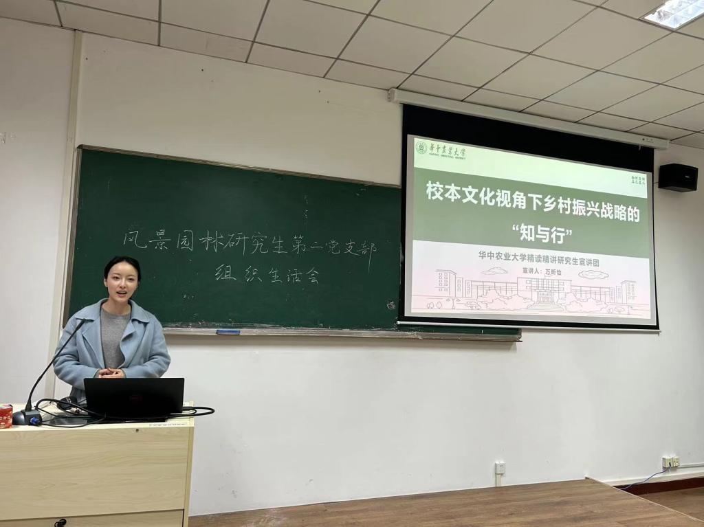 随后,潘玉莲同学带领大家学习2023年中央一号文件,详细分析了历年来中央一号文件对于风景园林学科发展的影响;万昕怡同学带领大家学习乡村振兴下的知与行,讲述了身边同学为乡村振兴做的贡献;刘哲媛同学带领大家学习雷锋精神;王怡霖同学带领党员们学习“两会”相关内容;胡紫薇同学带领大家学习党员不信教内容,讲述了党员为什么不能信教,强调了我们需要切实提高自身政治站位,坚定党员的理想信念。学习结束后,支部书记胡泽众进行学习总结。