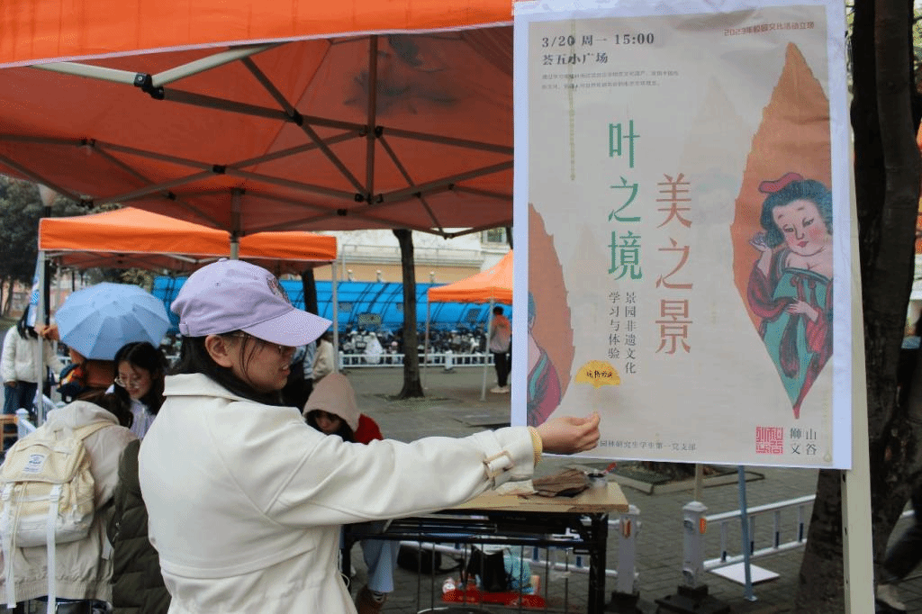 3月21日下午,由风景园林研究生第一党支部主办的“叶之境,美之景”校园文化立项活动在荟五小广场举行,吸引了来自园艺林学学院、生命科学技术学院、信息学院、文法学院等不同专业的本科及研究生参与体验。