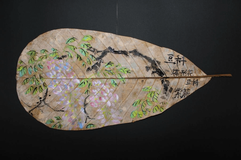 党支部副书记王熙悦为前来学习体验的同学介绍讲解,叶画是武汉的一项非物质文化遗产,以叶子为绘画载体,借助叶子的形状、色彩、纹理、经脉、褶皱、破损依势作画,是一种将自然与艺术融为一体,生命与绘画相结合,令人与自然更贴切的绿色环保艺术。