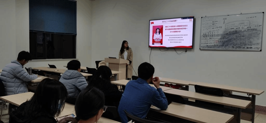 王梦佳同志从党的二十大框架为切入点对党的二十大精神展开了阐述,她先是以一段视频来展示过去十年的变化,她指出,在这十年间,我们党在人口控制、污水治理、空气质量管理、反腐倡廉、乡村振兴以及科技发明等方面都取得了较大的进展,攻克了很多的难题,取得了举世瞩目的成就。随后,王梦佳同志从党的实践成就、党的使命任务、党的重要保障以及党的使命担当这五个方面展开了党的二十大精神解读。