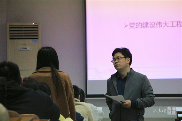 党课伊始,蔡江老师向同学们抛出一个问题:“党的建设伟大工程的由来是什么”,在大家思考片刻后,蔡江老师引用习近平总书记的重要论述向大家解答道:“把党的建设作为一项伟大工程来推进,是我们党的一大创举,是我们党领导人民进行伟大社会革命的重要法宝。要赢得革命的最终胜利,就必须把中国共产党建设成为一个全国范围的、广大群众性的、思想上政治组织上完全巩固的布尔什维克化的中国共产党。”接着,他向大家详细讲述了改革开放条件下我国成功开创并实施的伟大工程,并阐述了主要内容。他还提到,党的建设呈现出新的伟大工程创新的新局面,我国坚持和加强党的全面领导,全面从严治党纵深发展,全面增强干部的执政本领,党的建设新的伟大工程得到全方位加强。蔡江老师还播放了相关视频来加强同学们对此的理解。