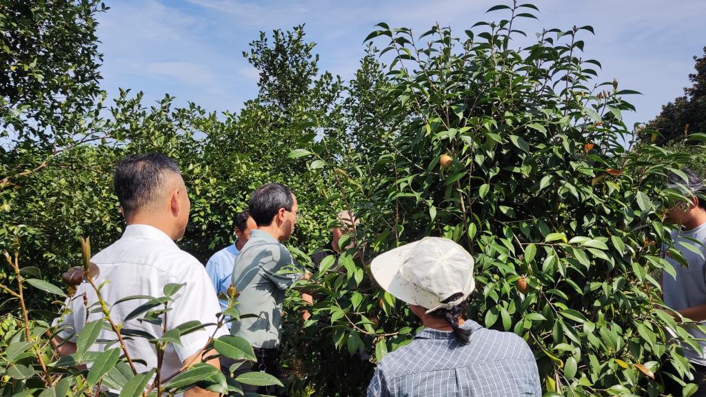 2023年8月18日,华中农业大学园艺林学学院暑期实践团抵达阳新县,由当地林业局局长袁知雄带领团队成员参观当地油茶良种基地和高产油茶区示范林。湖北省高产油茶区域示范林(阳新县示范点)地处阳新县城东新区何城村郑家咀。据介绍,示范林面积共480亩,按块状或带状多品种配置栽植,其中高产品种集中展示区300亩,栽植品种为长林4号、长林40号、长林53号,每个品种平均栽植约100亩;品比区域试验林区180亩,栽植品种为长林3号、长林18号、长林23号,鄂油102号、鄂油81号,湘林210号、华硕、华鑫、华金,共9个品种,平均每个品种栽植约20亩。团队成员走入油茶示范林地,发现整个示范林距统一为3米,行距有两种配置方式,其中一种为常规4米、另一种为宽窄行方式即3米和5米交替,经济示范林汪场长介绍到,这种宽窄行方式是为了更好地适应机械化操作。该油茶示范林为上世纪90年代栽植的板栗园改建而成,是按照湖北省油茶产业扩面提质增效行动发展的需要,在湖北省林业科学研究院、湖北省林木种苗管理总站联合指导下建设的示范基地。该基地作为油茶高产示范林、资源收集区、品比试验林和良种采穗圃,实现“四圃合一”,为湖北省油科研和产业高质量发展打下坚实基础。在参观过程中,团队成员发现,有的油茶品种芽很多但未结果,舒常庆老师讲到,可能是由于品种间花期不遇、授粉亲和力不高,在之后的基地建设中应注意品种的配置和疏花疏果,防止大小年情况的发生。