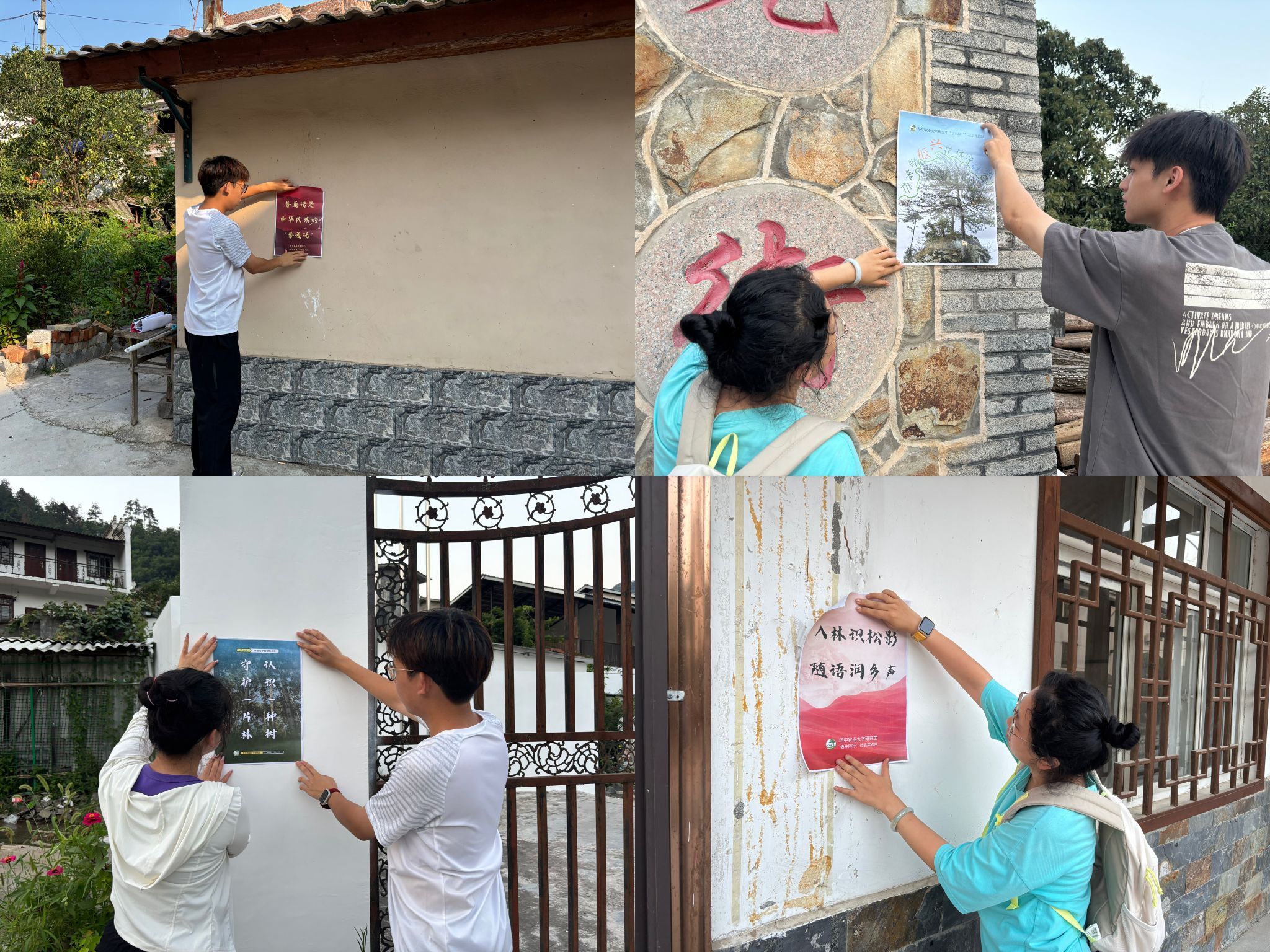 实践队员粘贴定制的巴山松科普及普通话推广海报
