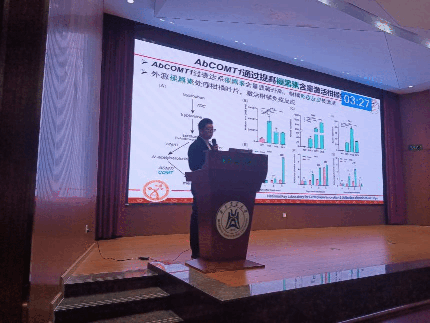 答辩环节中,候选人依次登台汇报,研究聚焦农业科技前沿与产业需求。林学博士周婷婷通过两年自然观测与多组学分析,介绍了光温信号调控树木季节性衰老的机制,为林木适应气候变化的机制研究提供新视角;果树学博士何政辰深耕柑橘红色性状,成功分离鉴定出山金柑果皮中特异积累的红色色素玉红黄质,挖掘出关键合成酶基因并研发玉红黄质细胞工厂;茶学博士普倩构建茶叶工业化加工品质组学研究技术体系,结合微生物组学、代谢组学解析茶叶加工品质的形成机制,其研发的合成微生物群落已在工业化发酵中初步应用,助力茶叶产业提质增效。