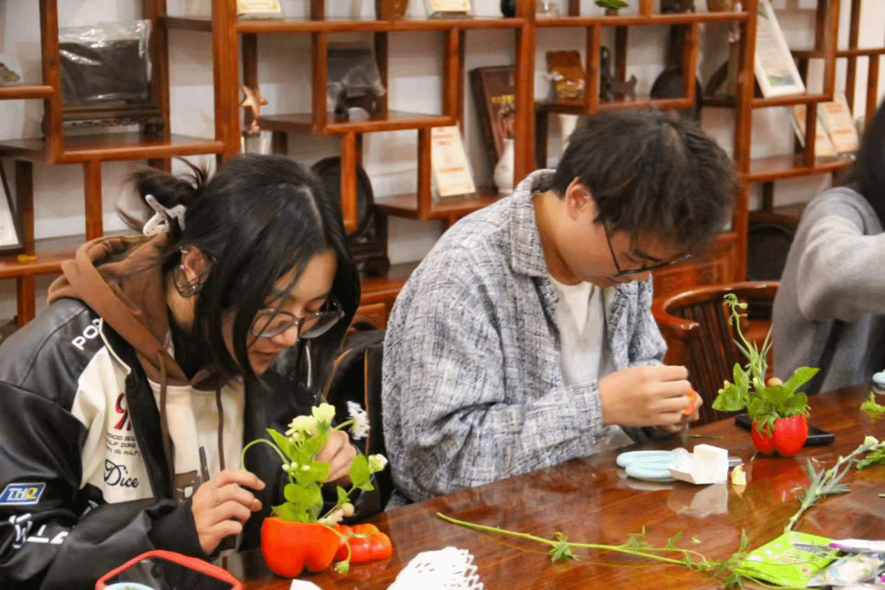 理论学习与工作交流结束后,与会成员移步耕读茶室,共同参与了一场别开生面的创意插花活动。大家以彩椒为容器,切盖、嵌剑山,再搭配各色鲜花与蘑菇,亲手打造出融合自然生机与艺术巧思的花艺作品。蔬菜与花卉的跨界融合,不仅体现了园艺学科的美学意蕴,也激发了团学骨干的创造活力。现场气氛热烈,多位团副表示:“活动形式新颖、富有启发性,在动手实践中深化了对专业融合与创新的理解。”