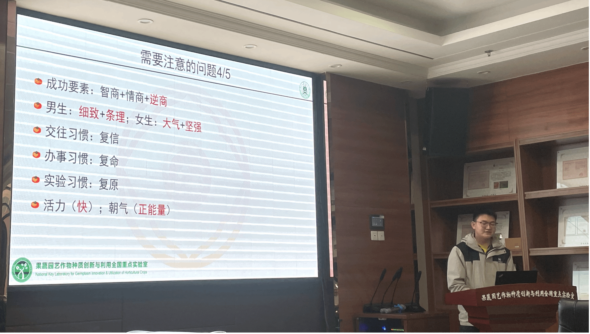 2025年12月20日下午在园林南楼206成功举办了园林院学术社区系列活动之设施蔬菜系专题“蔬香满园,智引未来”。本次活动由园艺林学学院研究生科学技术协会主办,旨在通过国家奖学金获得者的经验分享和九宫格自我介绍活动,促进学术交流与思维碰撞,展现设施园艺学与蔬菜学的发展活力与创新前景。