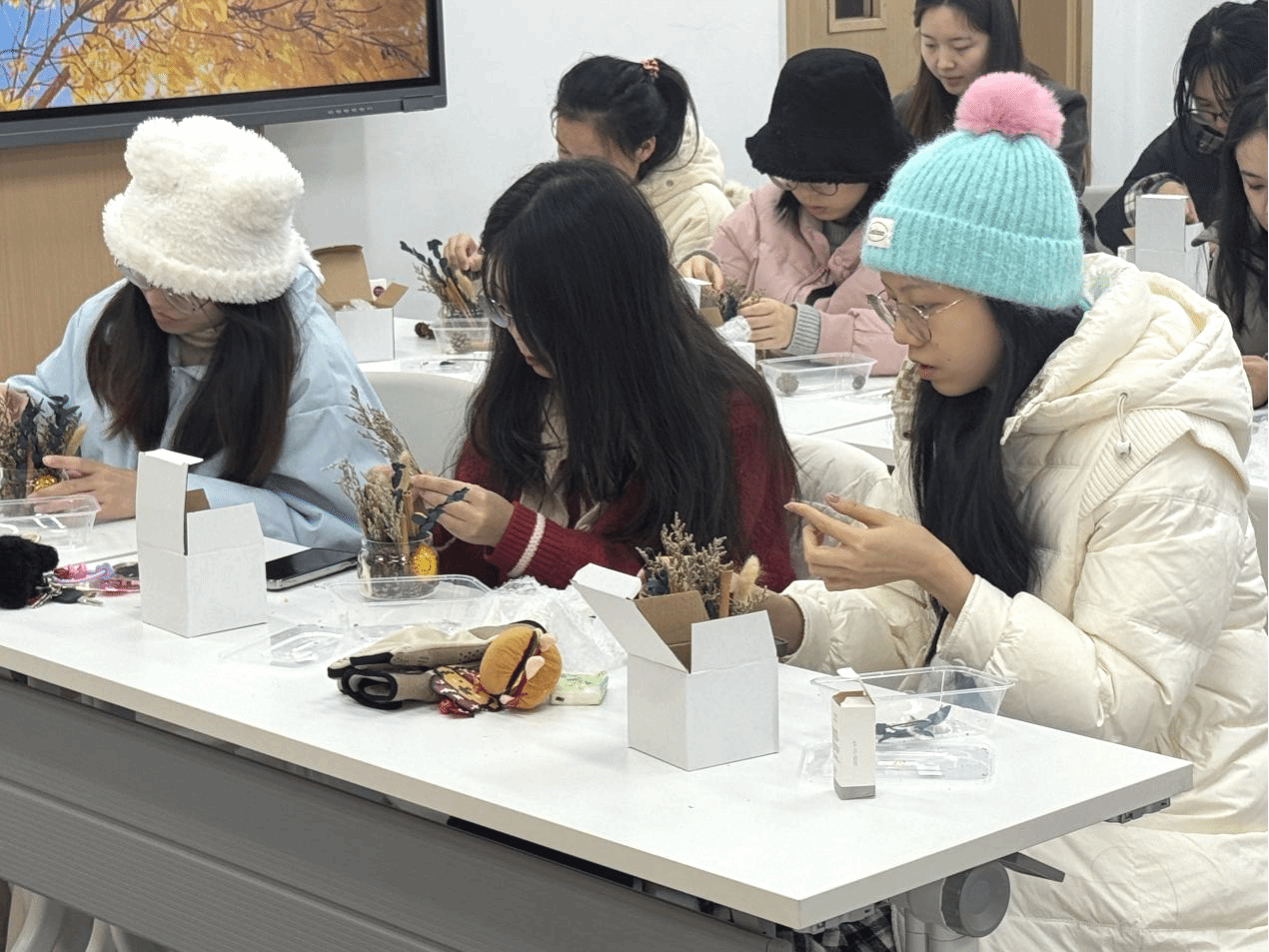 主办方为参与者准备了包含精油、植物花材和玻璃瓶在内的香薰材料包。在悠扬的背景音乐中,同学们将此次制作视为一次微缩的“造园”实践——依据个人喜好挑选香味与植物素材,将干花与枝叶置入瓶中,注入香氛,封存属于自己的“理想之境” 。现场,一个个精致的香薰瓶逐渐成型,仿佛一座座微缩的秘密花园,承载着创作者对自然与记忆的独特理解。